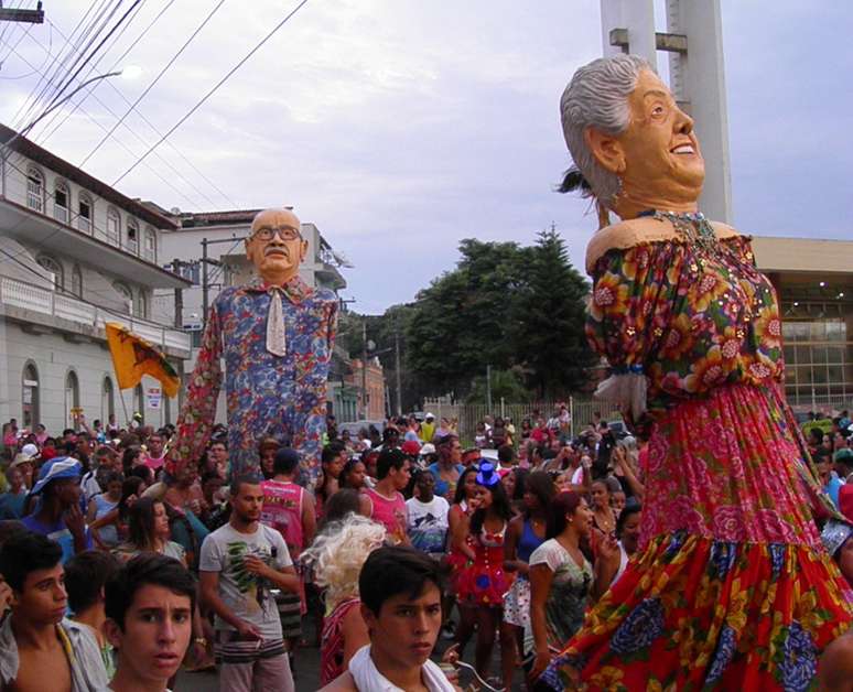 Bonecos gigantes com a figura de Zé Pereira e de sua mulher, Dona Juquita se destacam em meio aos foliões