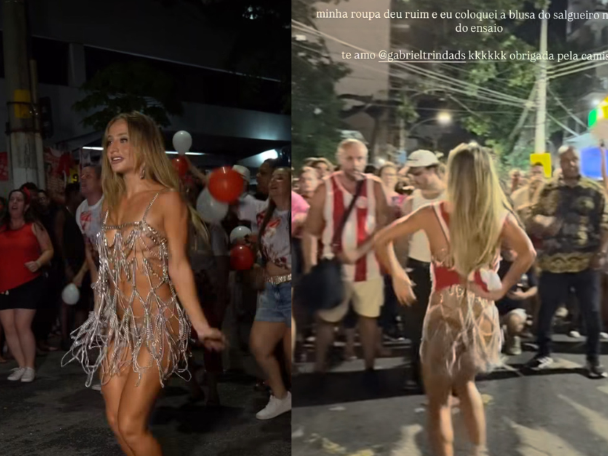 Bruna Griphao enfrentou um imprevisto com seu look ousado durante o ensaio do Salgueiro, mas improvisou com bom humor ao usar uma camisa da escola para continuar sambando e desfilando.