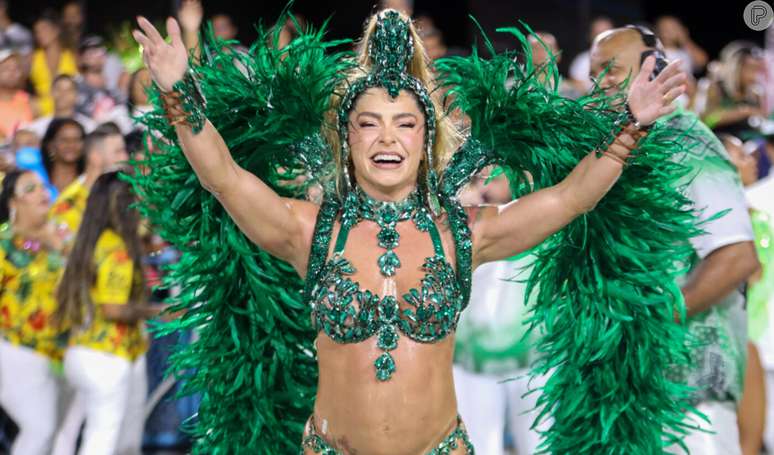 Assim como Viviane Araujo, que ensaiou com o Salgueiro na sequência e usou um biquíni micro, a rainha de bateria da Mocidade também precisou encarar a chuva na Sapucaí. E contou ter reforçado os treinos rumo ao dia do desfile (a verde e branca abre os trabalhos na segunda-feira dia 12).