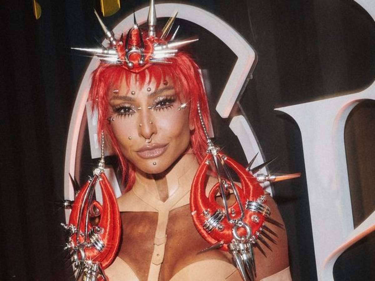Sabrina Sato aparece simulando uma nudez completa com corset de alta-costura, desenvolvido sob medida pela dupla britânica Whitaker Malem, transformando o corpo em escultura. Conhecidos por suas criações em couro para o cinema e para grandes maisons, Patrick Whitaker e Keir Malem desenharam uma peça em tom de pele que funciona como segunda pele, com recortes precisos que alongam a silhueta e criam a ilusão de um corpo nu moldado por linhas estruturais.