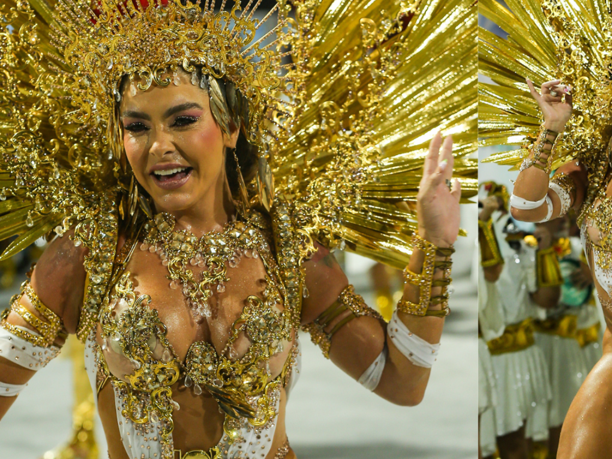 O figurino, em tons de dourado com nuances rosadas, apostou em um body ultracavado, bordado com cristais e arabescos metálicos sobre base nude, criando efeito de segunda pele cintilante. O desenho estratégico do decote e das laterais valorizava abdômen, coxas e braços definidos... resultado de uma preparação que envolveu musculação, cardio e acompanhamento nutricional ao longo de meses!