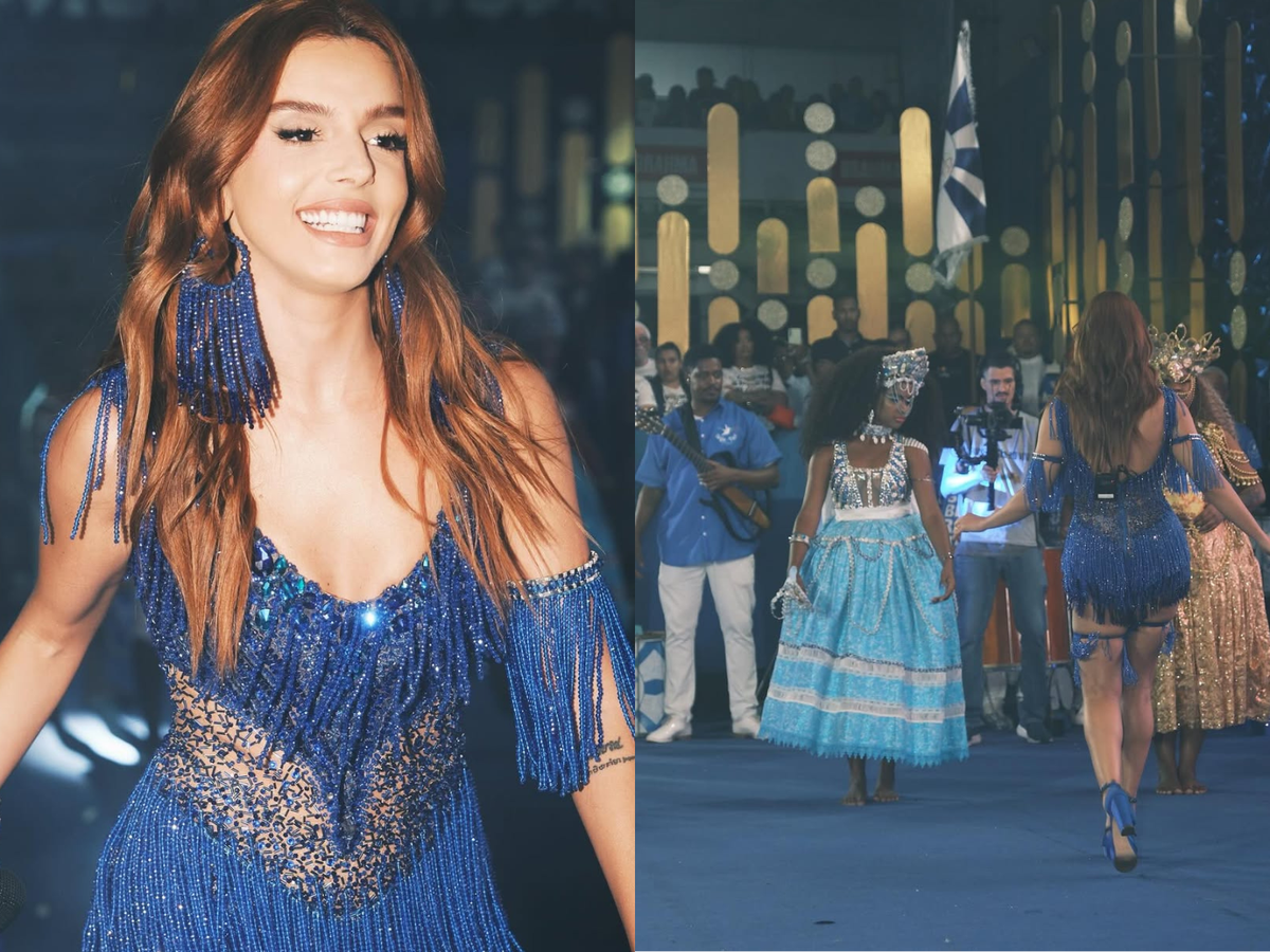 A atriz desfila como musa da escola de samba e é nora do presidente de honra e patrono da agremiação