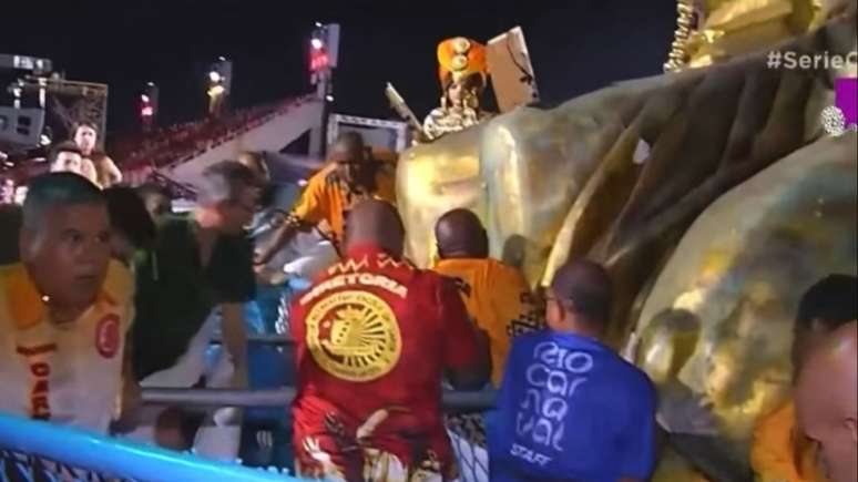 Incidente ocorreu após princípio de incêndio em alegoria; uma das vítimas sofreu fratura exposta e precisou passar por cirurgia em hospital no Rio de Janeiro