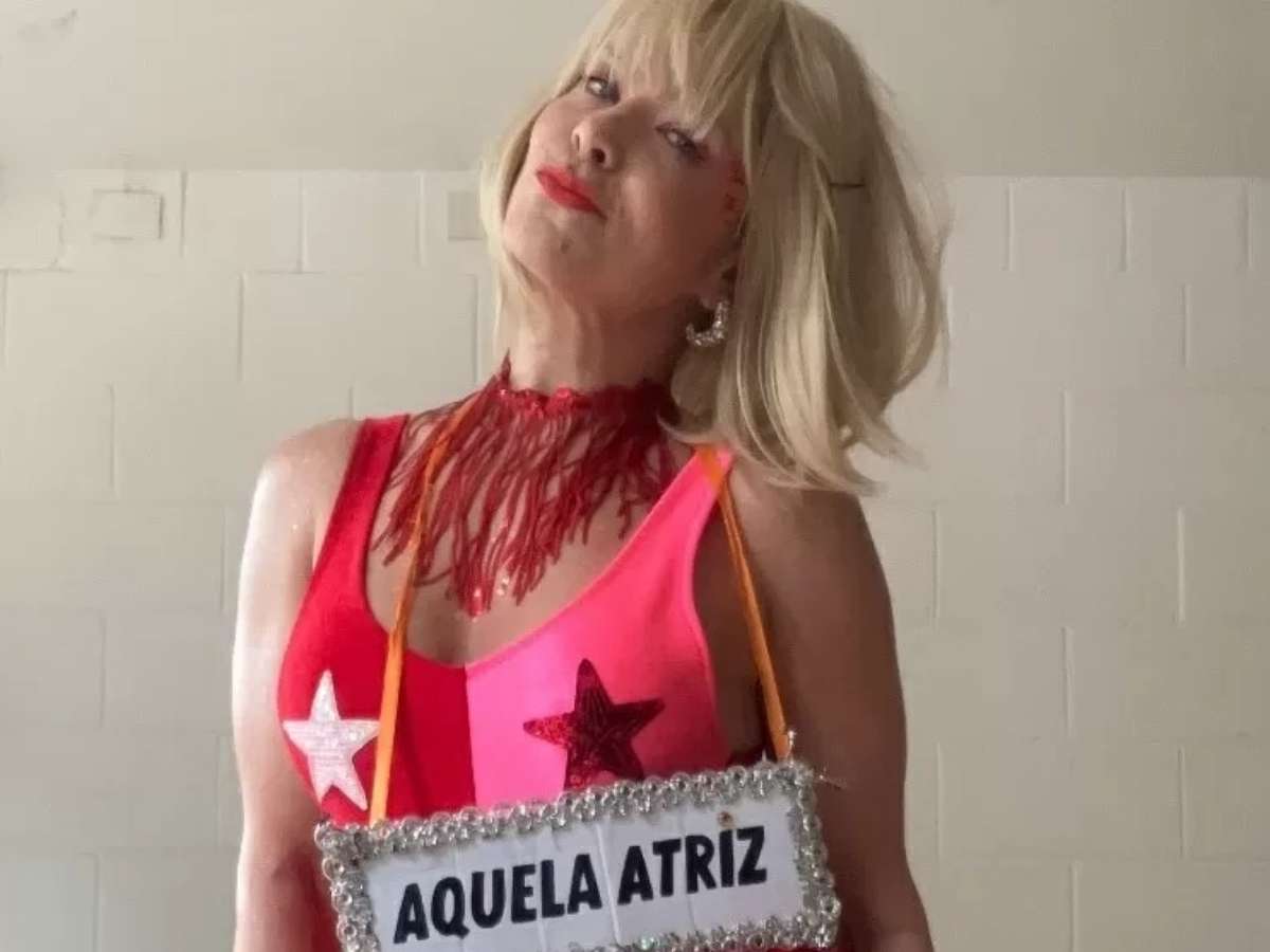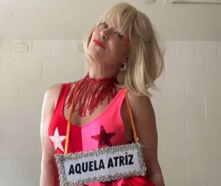 Samara Felippo voltou a abusar do bom humor e da ironia e mais uma vez usou uma plaquinha com a frase “aquela atriz” como adereço de sua fantasia.