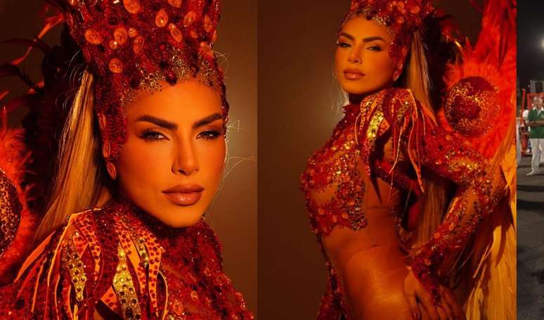 Influenciadora e Musa da agremiação, Erika Schneider abusou da ousadia, luxo e representatividade em sua fantasia para o desfile desta terça-feira (4). A ex-"A Fazenda" usou uma indumentária com cerca de 15 mil cristais bordados à mão, costeiro feito do vermelho pro amarelo remete a uma chama.