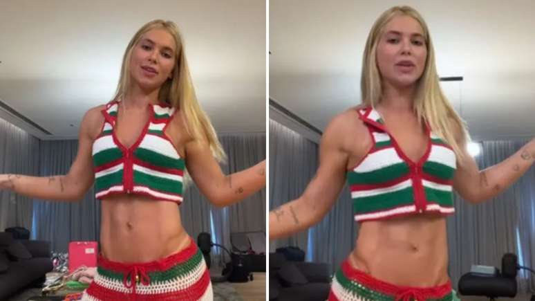 O conjunto escolhido é da marca Favorito Crochê e foi composto por cropped e calça confeccionados artesanalmente. O top, com modelagem reta e fechamento em zíper nas costas, está avaliado em R$ 329 e foi desenvolvido em ponto fechado, garantindo conforto e evitando transparências. Já a calça, que possui regulagem na cintura para melhor ajuste ao corpo, custa R$ 729. Somadas, as duas peças totalizam R$ 1.058.