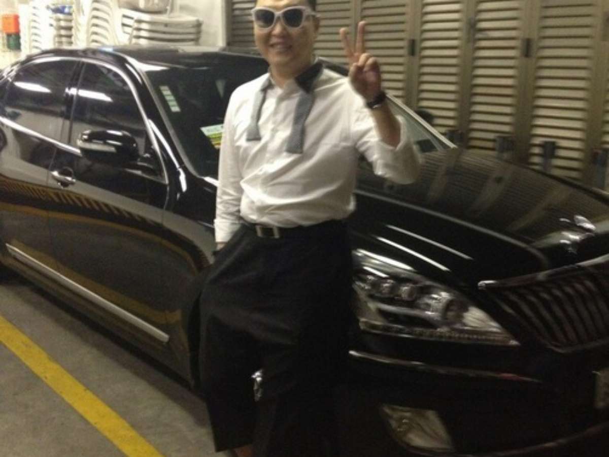 Na imagem, Psy aparece ao lado de um carro Hyundai Equus fazendo pose. Com gel no cabelo e óculos escuros – sua marca registrada – o cantor se preparava para curtir mais um dia de Carnaval no Brasil.