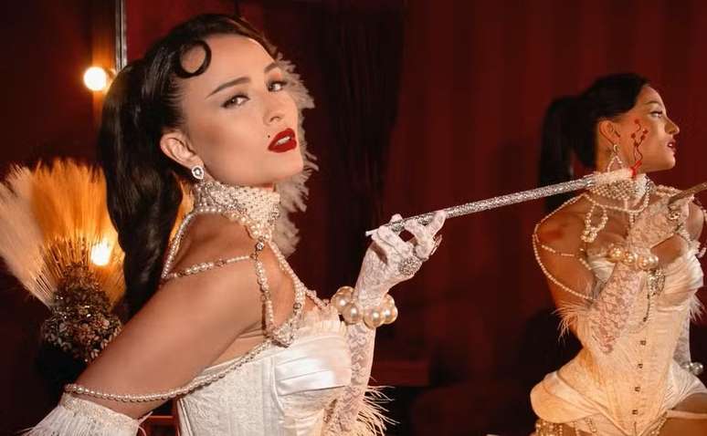 Nos bastidores do ensaio, Larissa mostrou detalhes do figurino escolhido: peças brancas com espartilho, aplicação de pérolas, meias transparentes, cinta-liga, plumas e um adereço de cabeça volumoso, elementos que reforçam a estética inspirada no universo burlesco.