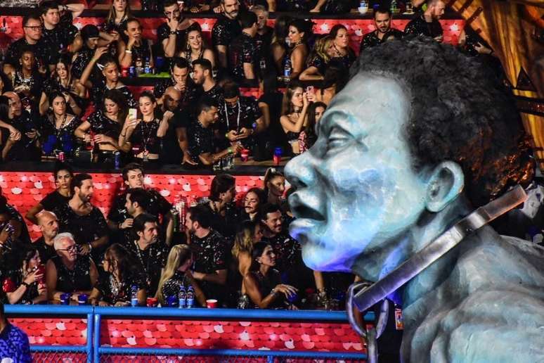 Na foto aparece o quarto carro da agremiação, batizado de Travessia, que traz a cabeça de um homem preso pelo pescoço, representando escravizados que mantinham sua jornada pelo Atlântico nos navios negreiros. Ao fundo, se vê o público desinteressado pelo desfile.