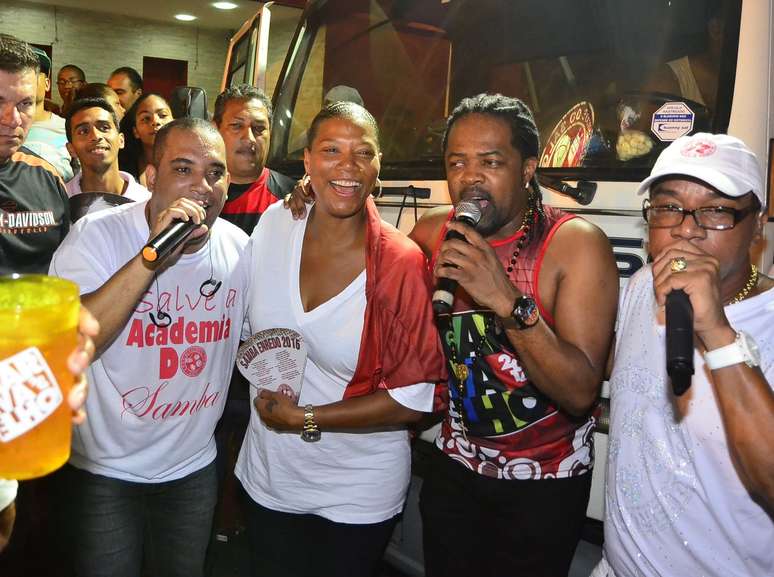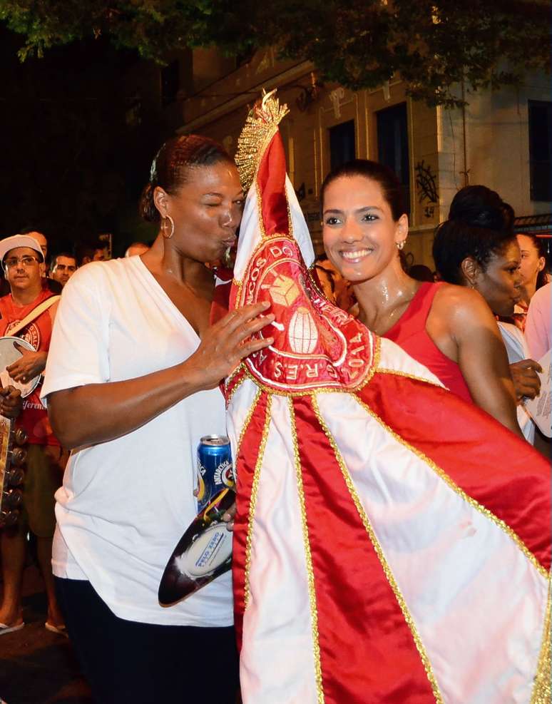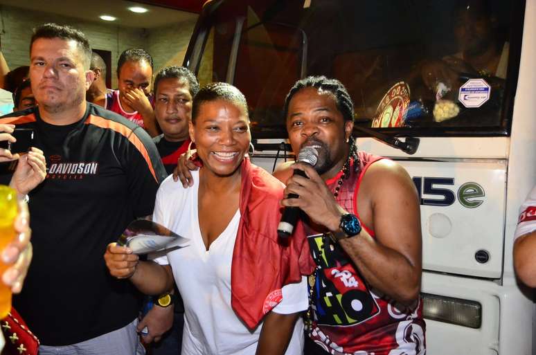 A rapper americana Queen Latifah, que está no Brasil, caiu na farra ao lado do cantor Xande de Pilares e mostrou que já está no clima do Carnaval brasileiro.