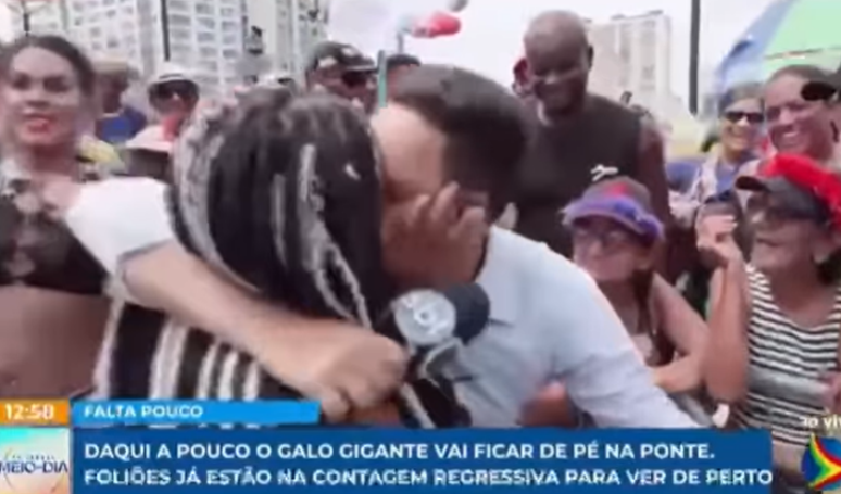 O repórter Rodrigo de Luna, da TV Jornal, recebeu todo o carinho de uma foliã durante a cobertura da subida do Galo da Madrugada na tarde de quarta-feira, 11. Enquanto entrevistava uma mulher, o jornalista recebeu um pedido para ser beijado e atendeu ao desejo.