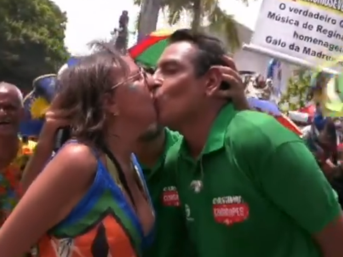 O repórter Rafael Cabral trocou um beijinho com uma foliã durante a transmissão ao vivo do carnaval de Olinda, em Pernambuco, na tarde desta segunda-feira, 3. A cena foi exibida pela TV Guararapes, afiliada da Record.