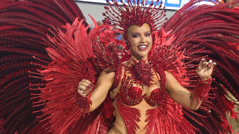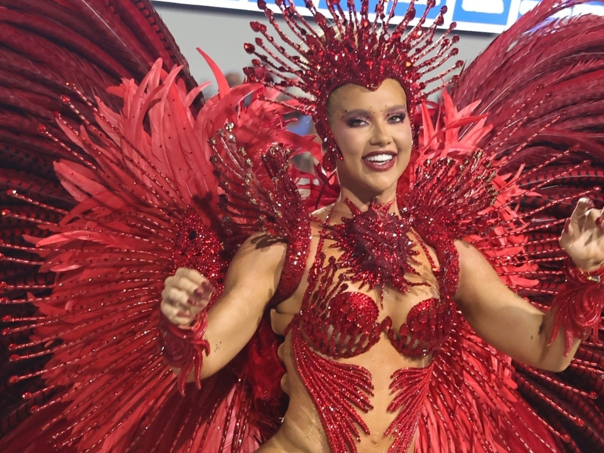 A influenciadora digital contou que usava uma roupa que pesava 15 kg. A fantasia dela tinha um longo costeiro vermelho com penas e luzes de led, que acendia nas cores vermelho e verde. Incomodada com o figurino, ela tirou a parte das plumas do costeiro quando estava na Marquês de Sapucaí.