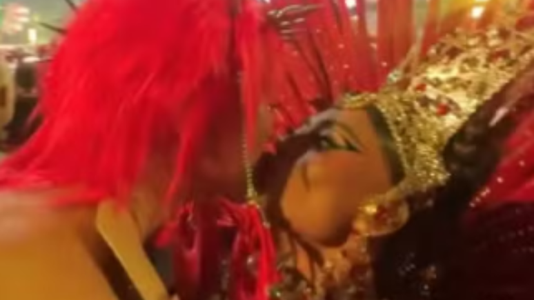 Juliana Paes e Sabrina Sato dão selinho durante desfile da Viradouro