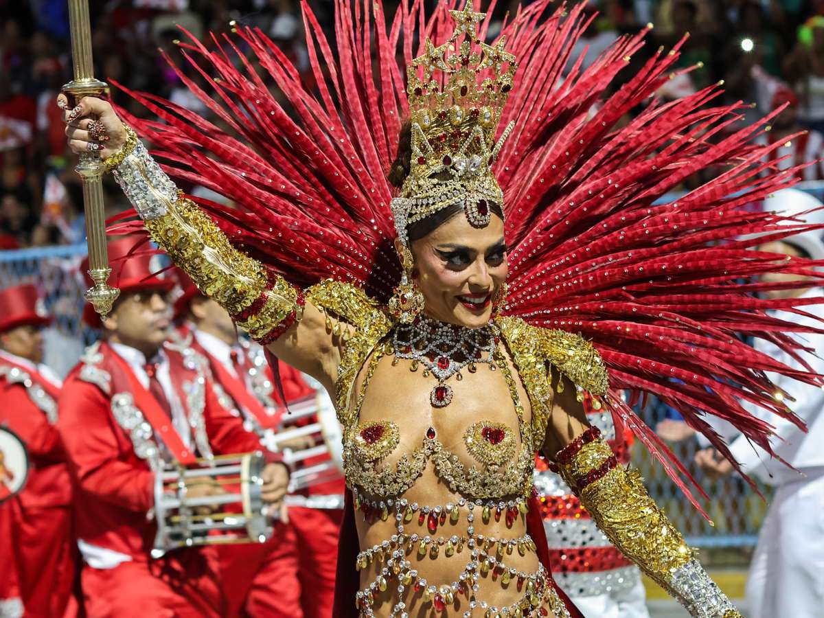 A atriz Juliana Paes, de 46 anos, esbanjou luxo e opulência com uma fantasia assinada pela grife italiana Dolce & Gabbana em sua reestreia como rainha de bateria da Unidos de Viradouro, no Sambódromo da Marquês de Sapucaí, no carnaval do Rio de Janeiro, na madrugada desta terça-feira, 17.