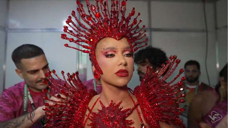 A influenciadora mostrou o momento em que vestiu sua fantasia de 15 kg e fez os preparativos finais no look ao lado de amigos, familiares e funcionários. A roupa tem luzes que piscam com as cores da escola, o verde e o vermelho.