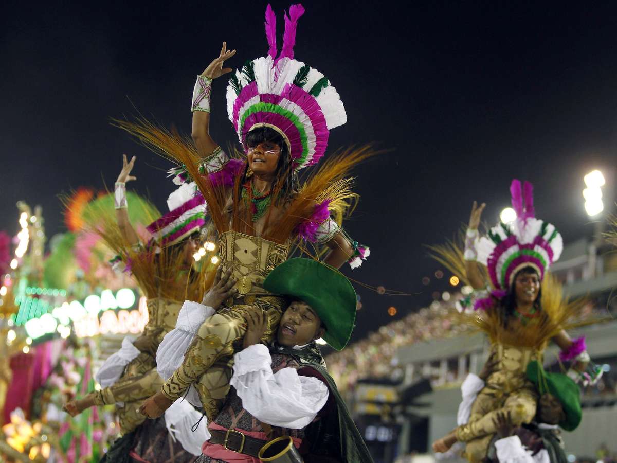 A comissão de frente da Mangueira, chamada de 'Formação do povo cuiabano' trouxe os componentes vestidos de índios, que ofereciam o peixe pacu, representando uma lenda da cidade.
