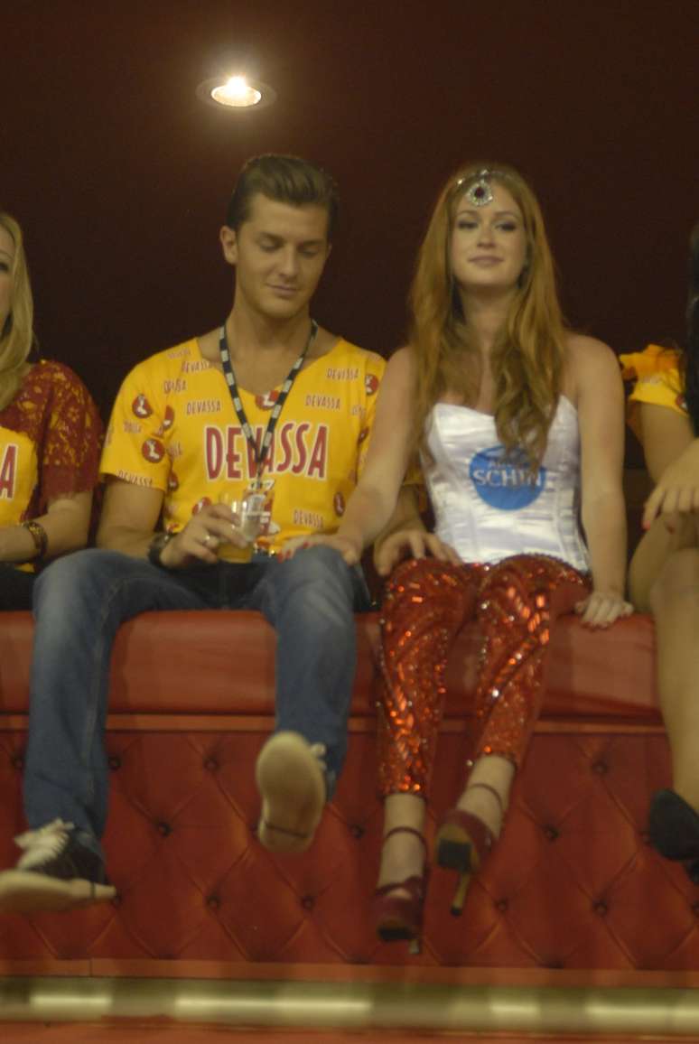 A atriz Marina Ruy Barbosa, 17 anos, chegou ao camarote da Devassa com o namorado, Klebber Toledo, os pais, Gil e Paulo, e uma amiga. O que chamou atenção foi o modelito: calça vermelha bordada com spikes e pedrarias e um top tomara que caia, da água Schin, já que é menor de idade e não pode usar a camiseta da Devassa.