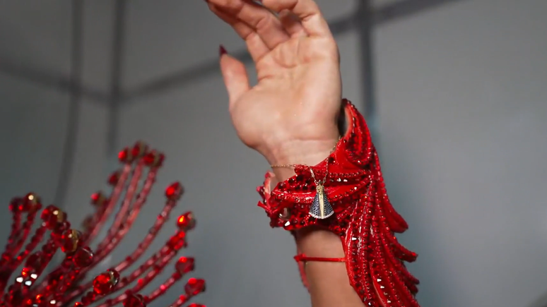 "Amei meu, amor. Te amo muito. Faltou você aqui, mas eu entendo", falou Virginia ao receber o presente de Vini. O jogador não pôde ir à Sapucaí devido a compromissos com o Real Madrid, time pelo qual joga na Espanha.
