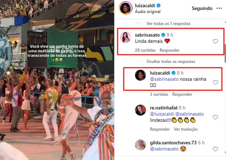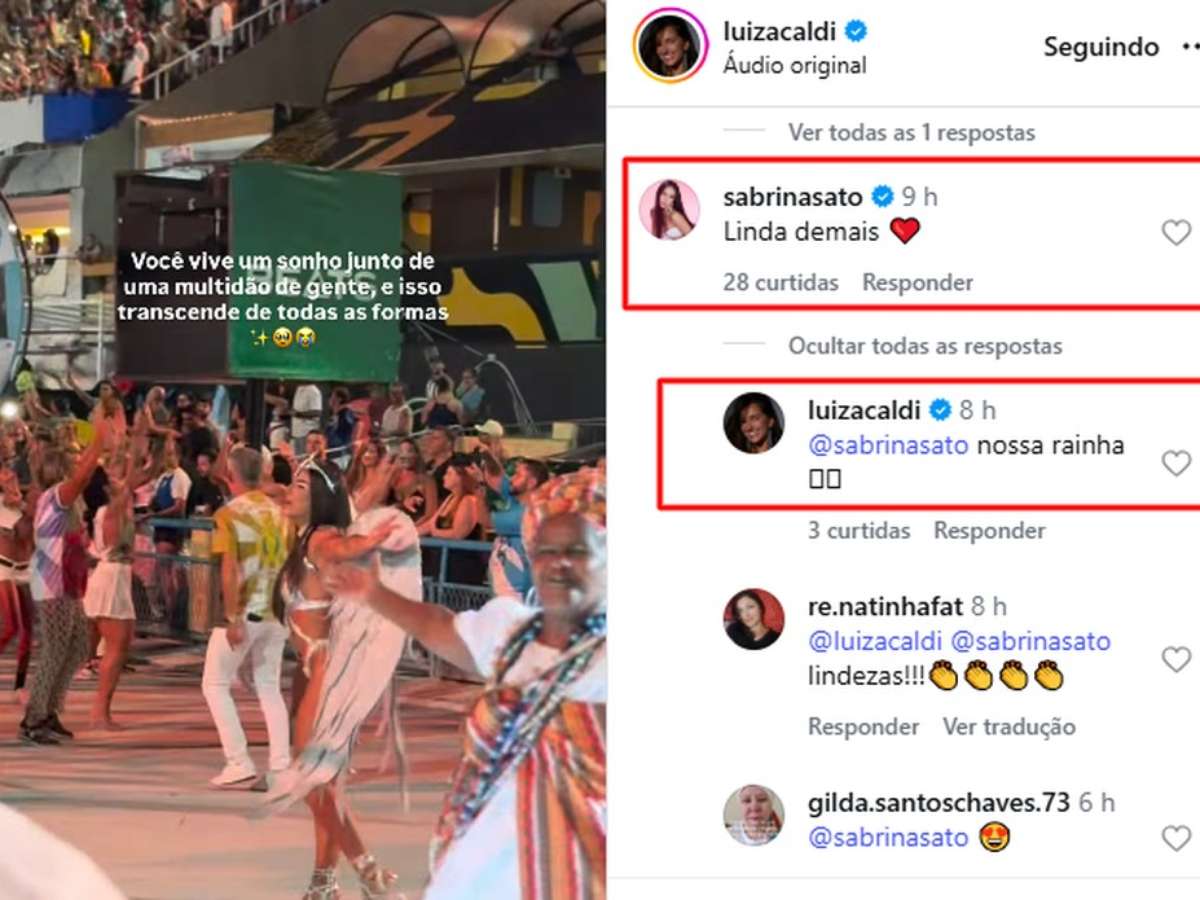 O que conecta ainda mais os nomes das duas, além do samba no pé, é o ator Nicolas Prattes. Sabrina Sato, atual esposa do artista, fez questão de demonstrar publicamente respeito e admiração pela ex-namorada do marido. Após um ensaio recente, Luiza Caldi publicou um vídeo em que aparece visivelmente emocionada com a experiência de desfilar pela segunda vez consecutiva na escola. Na legenda, ela escreveu: "O que a gente tá vivendo é tão forte, que escorre pelos olhos. Tá chegando, Vila Isabel. Pra você, Heitor".
