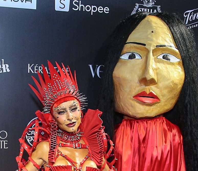 Na maquiagem, assinada por Krisna, Sabrina Sato apostou em cristais que formavam duas linhas na área da sobrancelha, além de batom vermelho, para combinar com a roupa.