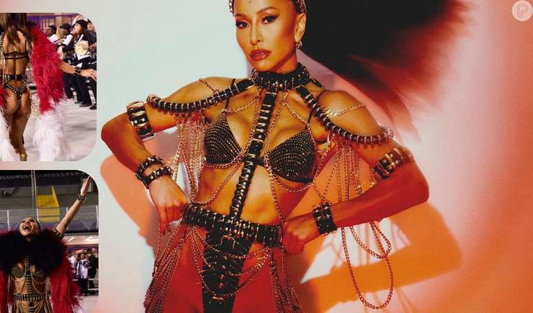 Sabrina Sato reforçou que é dona de produções arrasadoras quando o assunto é o carnaval. E para comemorar seus 20 anos de Gaviões da Fiel, a apresentadora apostou um look cavado, cheio de correntes nas cores prata e dourado e deixou a virilha e o bumbum à mostra em ensaio da preta e branca no Sambódromo do Anhembi nesta quinta-feira (25) à noite, em São Paulo.