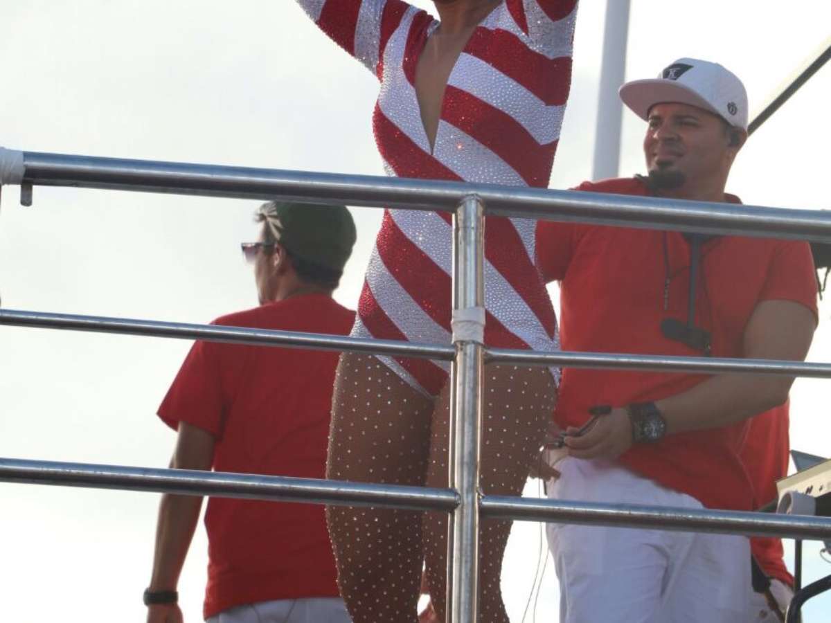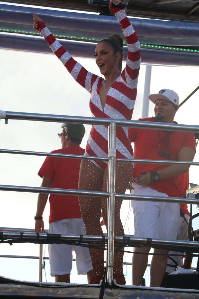 Com a música de trabalho "O Doce", a cantora tem mostrado figurinos "adocicados" no trio, como de sorvete e cupcake colorido. Desta vez, a proposta é um body decotado com listras diagonais em vermelho e branco. Para completar, meia-arrastão e sandália vermelha. Os modelitos são assinados por MichellyX com styling de Clara Lima.