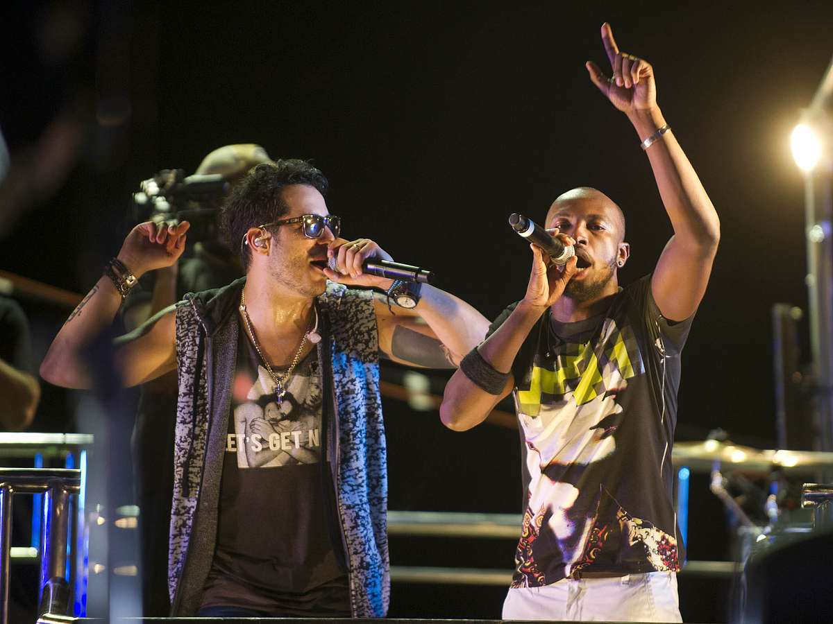 Ex-vocalista do Exaltasamba, pagodeiro Thiaguinho cantou ao lado de Tomate, antigo líder do Rapazolla, no bloco Eu Vou/Agito, circuito Barra-Ondina do Carnaval de Salvador
