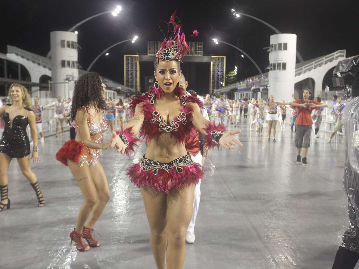 Garoou, chegou até a chover forte. Mas as beldades não se incomodoram - ou ao menos não demonstraram isso - e embelezaram a avenida do Sambódromo do Anhembi, na zona norte de São Paulo, neste domingo (16). No local que foram realizados os ensaios técnicos para o Grupo Especial do Carnaval 2014 com as escolas de samba Dragões da Real, Acadêmicos do Tatuapé e Acadêmicos do Tucuruvi. Na foto, Lívia Andrade