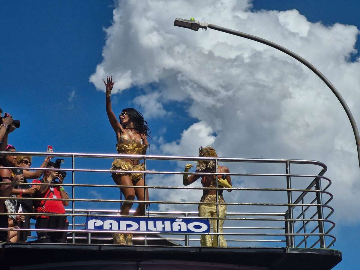A cantora, em diversos momentos, pediu para que os presentes tomassem água e passassem protetor. "O calor tá babado. A gente vai aí embaixo passar bronzeador em vocês", anunciou antes da equipe aplicar o produto em foliões mais próximos do trio.