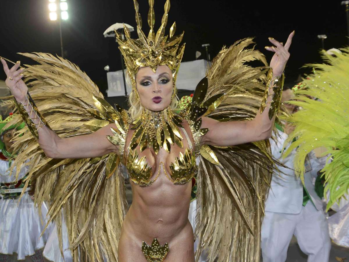 Achou pouco? Entao vamos aos números: Gabriela vem a frente do carro que representa religião na Águia de Ouro com fantasia banhada a ouro 18 kilates, com 8 mil cristais entre swarovski e italianos e quase 500 penas de faisão.