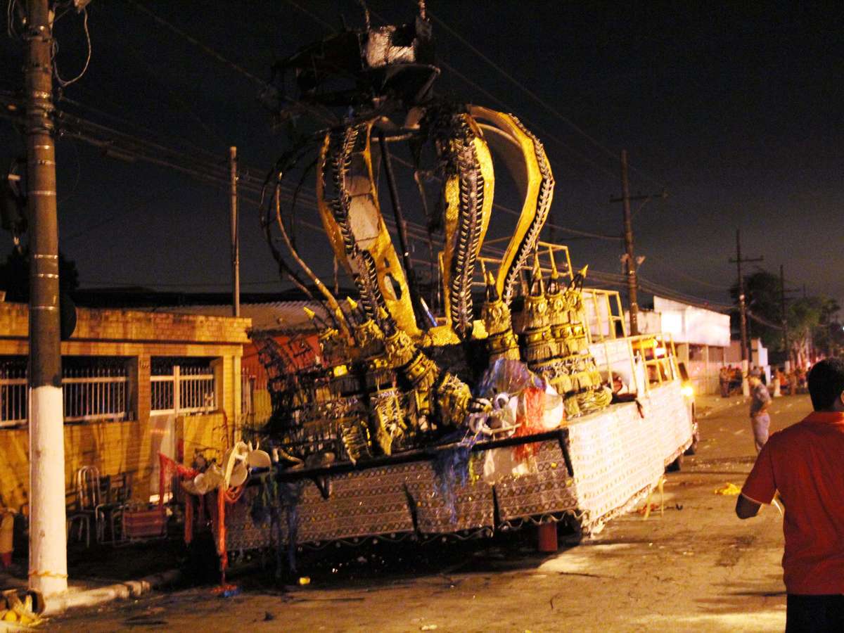 Um carro alegórico da escola de samba Sangue Jovem, de Santos, no litoral de São Paulo, pegou fogo na madrugada desta terça-feira (12), logo após o desfile da agremiação