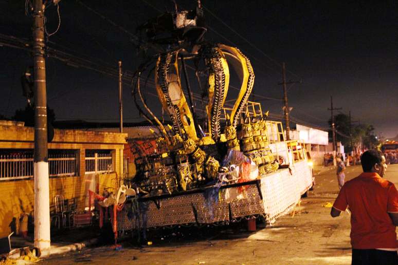 A alegoria encostou em uma rede elétrica, o que causou o incêndio e um apagão no sambódromo Dráuzio da Cruz