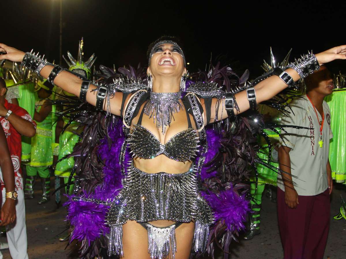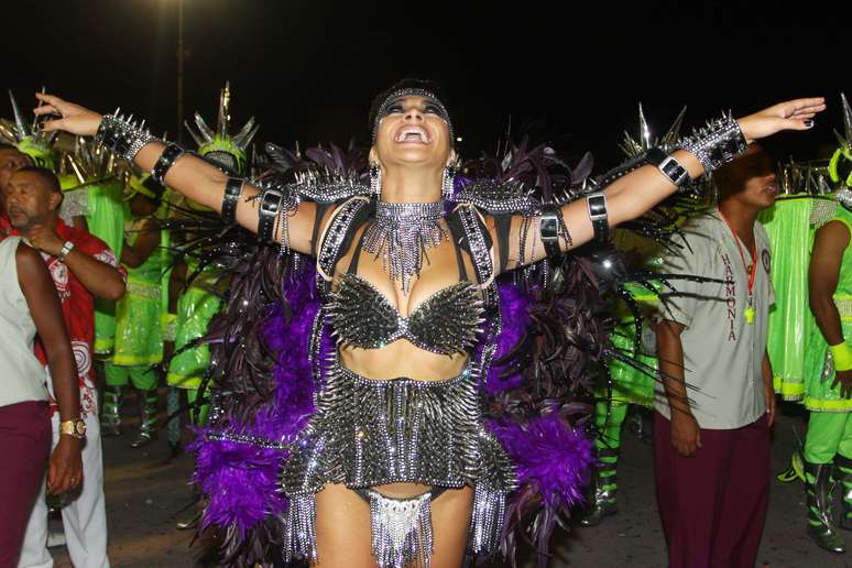 Com o enredo 'Os condutores de Alegria, numa fantástica Viagem aos Reinos da folia', a Rosas de Ouro levantou a arquibancada. Camila Basilio, filha da presidente da escola, Angelina Basilio, substituiu Ellen Roche á frente da bateria e não fez feio no Desfile das CampeãsFoto: Marcos Bezerra / Futura Press