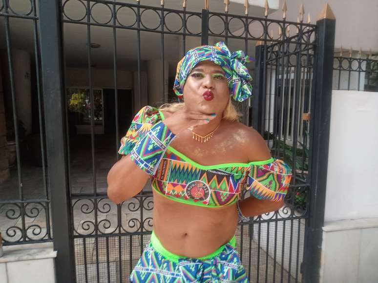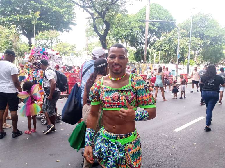Com uma maquiagem vibrante e vestido com a fantasia deste ano-- que busca valorizar a representatividade da África, o enfermeiro Lucas Santos, de 40 anos, destacou que as pistolas não representam a história do bloco.