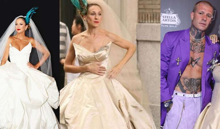 Na produção, o vestido usado por Carrie no casamento com Mr. Big é um Vivienne Westwood - recriado para o spin-off "And Just Like That" -, mas em terras brasileiras ele ganhou versões tão estilosas quanto.