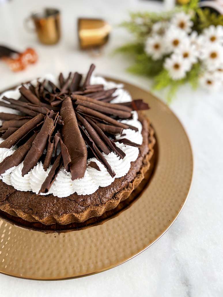 Para a massa: 250 g de farinha de trigo; 25 g de cacau em pó; 135 g de manteiga sem sal; 40 g de açúcar; 10 a 25 ml de água fria. Para o recheio e decoração: 165 g de manteiga sem sal em temperatura ambiente; 250 g de açúcar mascavo; 4 ovos; 25 g de cacau em pó; 150 g de chocolate meio amargo derretido; 300 g de creme de leite; 200 g de creme de leite fresco bem gelado para a decoração; 25 g de açúcar para a decoração.