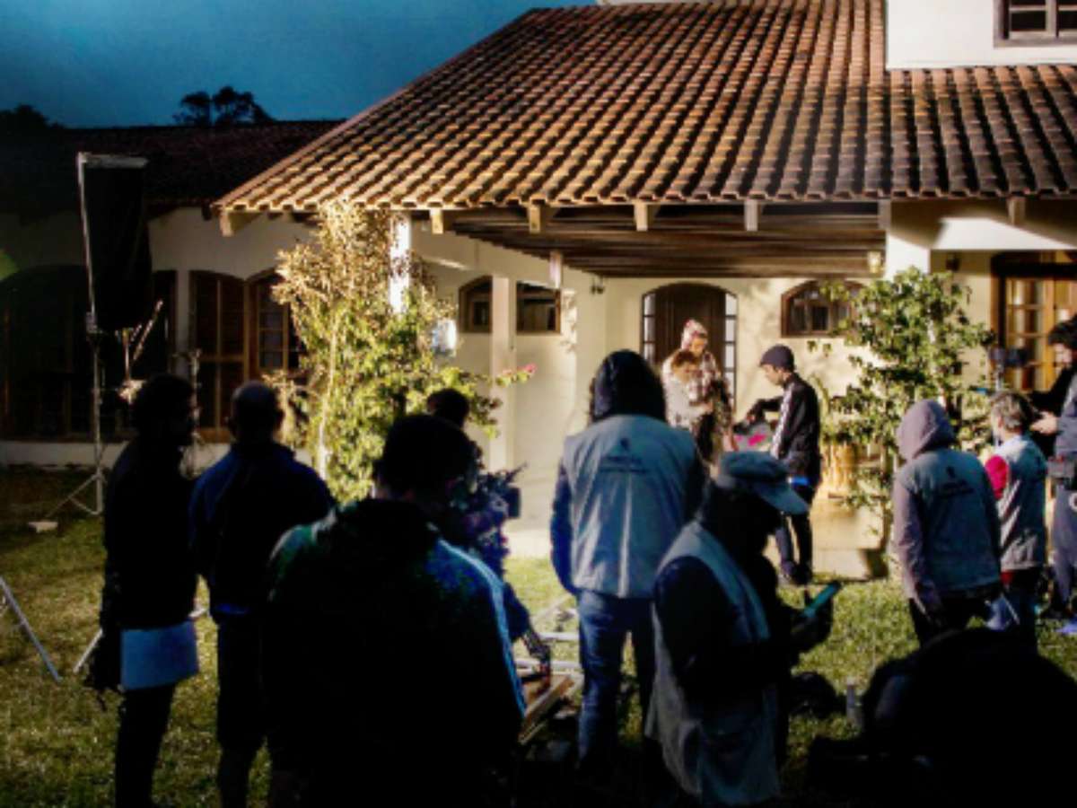 Em foto de bastidores, Roly Santos dirige Luiz Guilherme, Roberto Birindelli e Mayana Neiva no set.