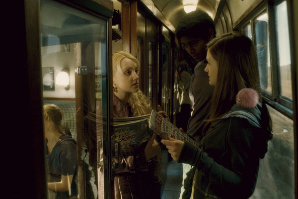 Lovegood (Evanna Lynch) conversa com Gina Weasley (Bonnie Wright) no Expresso de Hogwarts