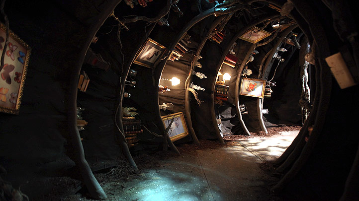 O corredor de livros e bugigangas por onde Alice cai até o País das Maravilhas