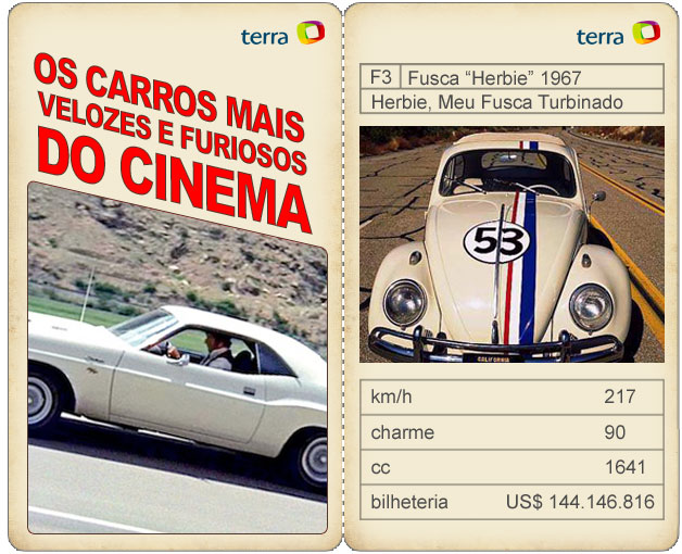 Talvez dentre todos os carros estrelas de cinema, esse seja o mais famoso. Afinal de contas, até hoje volta e meia você cruza na rua com uma orgulhosa réplica Herbie circulando pela cidade. Simpático, pequeninho e veloz. Sim, porque se na vida real o fusquinha não acelera exatamente como um carro de corrida, na ficção ele passa dos 200 km/h. Não é à toa que ultraleves voam com o motor desse Volkswagen.
