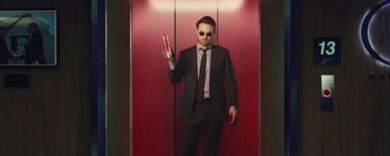 O Twitter de Os Defensores publicou um pôster de Matt Murdock (Charlie Cox) entrando no elevador da Rand Enterprises, pronto para botar para quebrar. "Cuidado, Demolidor".