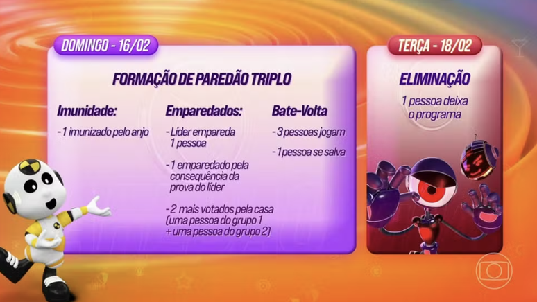 No domingo, 16, os brothers votam para a formação de um paredão triplo. O líder empareda uma pessoa, uma consequência da prova do líder empareda outra e a casa vai emparedar as duas mais votadas (uma do grupo 1 e a outra do grupo 2). Três participarão da prova bate-volta, mas só uma se salva.