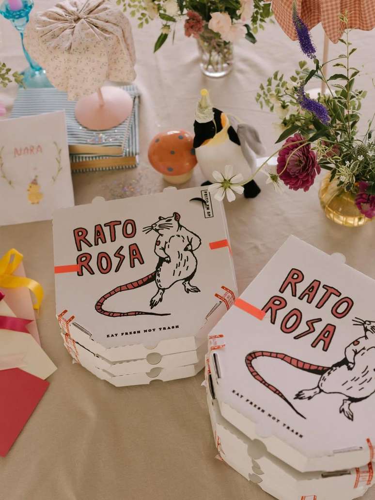 Outro ponto alto foi a personalização de itens simples, como as caixas de pizza com ilustrações exclusivas. Isso prova que cada detalhe do evento pode reforçar o tema escolhido de maneira criativa e única.