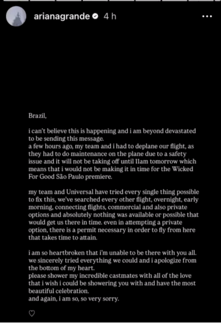 "Há algumas horas, eu e minha equipe tivemos que desembarcar do nosso voo, pois eles precisavam fazer manutenção no avião devido a um problema de segurança, e o voo só decolará às 11h da manhã de amanhã", iniciou Ariana Grande em um texto publicado em sua conta oficial no Instagram. "Minha equipe e a Universal tentaram de tudo para resolver isso, procuramos todos os outros voos, noturnos, de madrugada, com conexões, voos comerciais e também opções de voos particulares e absolutamente nada estava disponível ou era possível que nos levasse até lá a tempo".