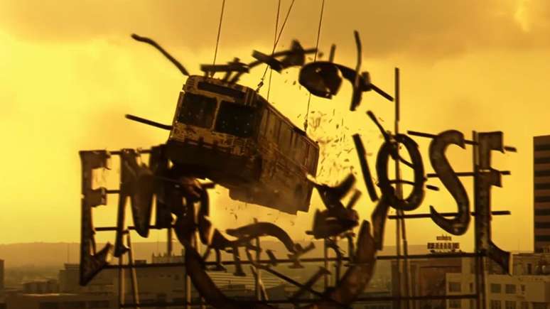 Um helicóptero, um ônibus e Los Angeles marcam o momento.