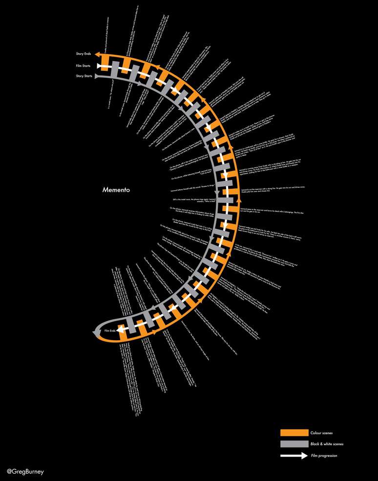 No infográfico podemos ver como estão dispostas as cenas em preto e branco e coloridas, bem como a progressão da história. Enquanto no filme cenas do passado são alternadas com as do…