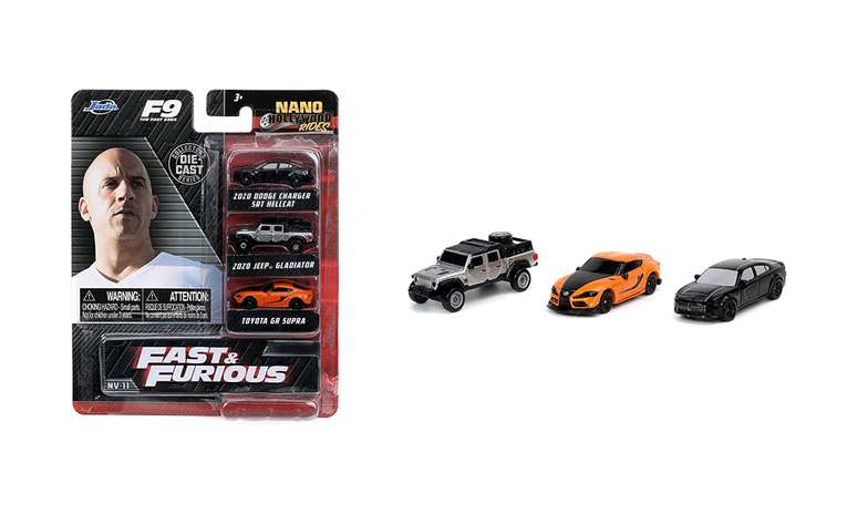 Mas se o que você ama mesmo são os carros que roubam a cena da franquia, espere para ver este pack de miniaturas de três veículos icônicos. O kit vem com um mini 2020 Dodge Charger SRT Hellcat, um mini 2020 Jeep Gladiator e um mini Toyota GR Supra. Encontre na Amazon por R$ 117,00.