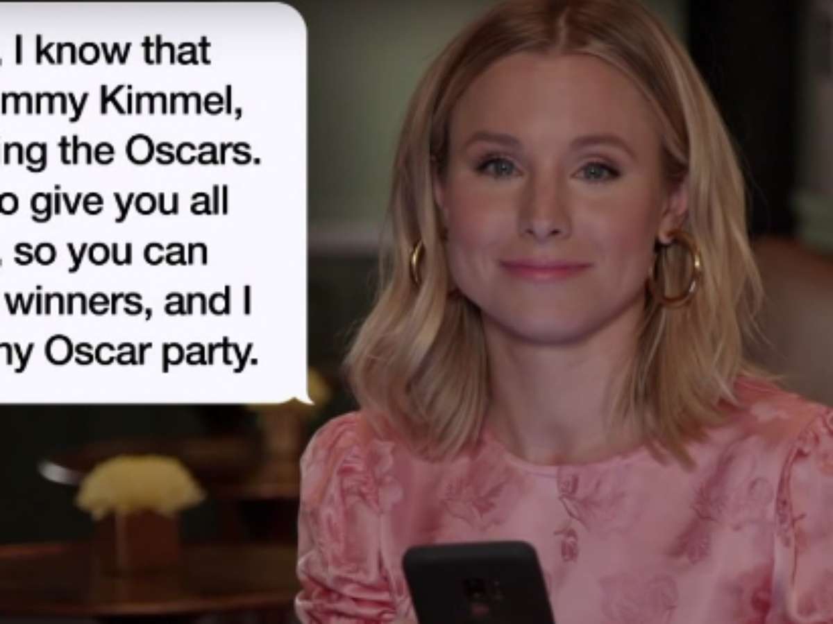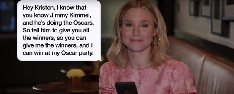 Kristen Bell: "Oi Kristen, eu sei que você conhece Jimmy Kimmel e que ele irá apresentar o Oscar. Então diga para ele te contar todos os vencedores, para que você possa me dizer quem são e os vencedores e eu possa ganhar na minha festa do Oscar."
