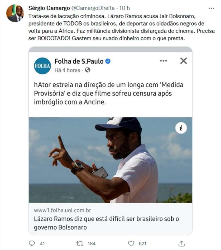 Em tuites publicados nesta terça (12/3), Camargo afirma que o diretor Lázaro Ramos acusa Bolsonaro de deportar os cidadãos negros de volta para a África. E, por conta disso, pede que o filme seja boicotado.